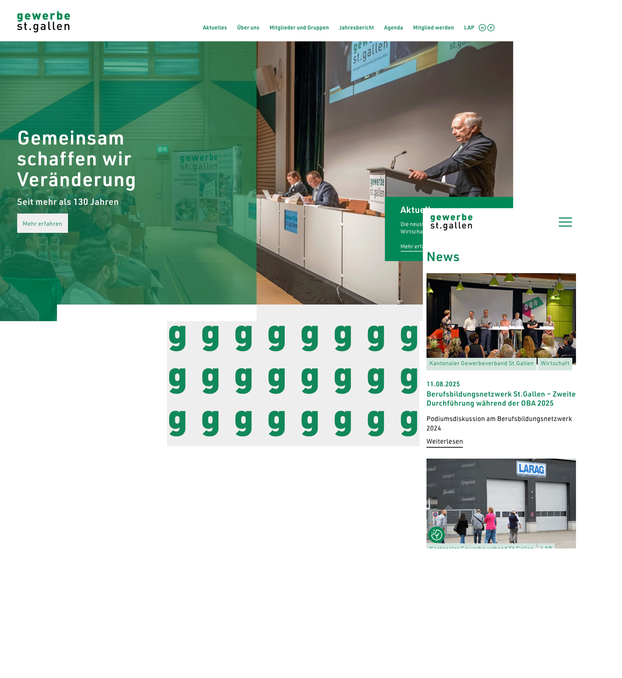 Für den Gewerbeverband St. Gallen setzten wir ein umfangreiches Webprojekt mit vier eigenständigen Webseiten um: für die Geschäftsstelle, den Kanton, die Stadt sowie eine Newsseite für das monatliche Magazin „Wirtschaft“. Eine zentrale Herausforderung war es, die grosse Menge an Informationen verständlich und übersichtlich auf die verschiedenen Seiten zu verteilen. Zusätzlich mussten Inhalte so konzipiert werden, dass sie flexibel auf mehreren Seiten erscheinen können. Über eine Schnittstelle wurde das bestehende Personenverzeichnis nahtlos eingebunden. Damit die Instandhaltung dieser komplexen Webseitenstruktur möglichst einfach bleibt, entwickelten wir eine klare und intuitive Administrationslösung. Gemeinsam mit einer externen UX/UI-Designerin entstand ein modernes, offenes Webdesign, das bestehende Logos und Farben aufgreift und in eine frische, zeitlose Gestaltung überführt, die auch langfristig aktuell wirkt.