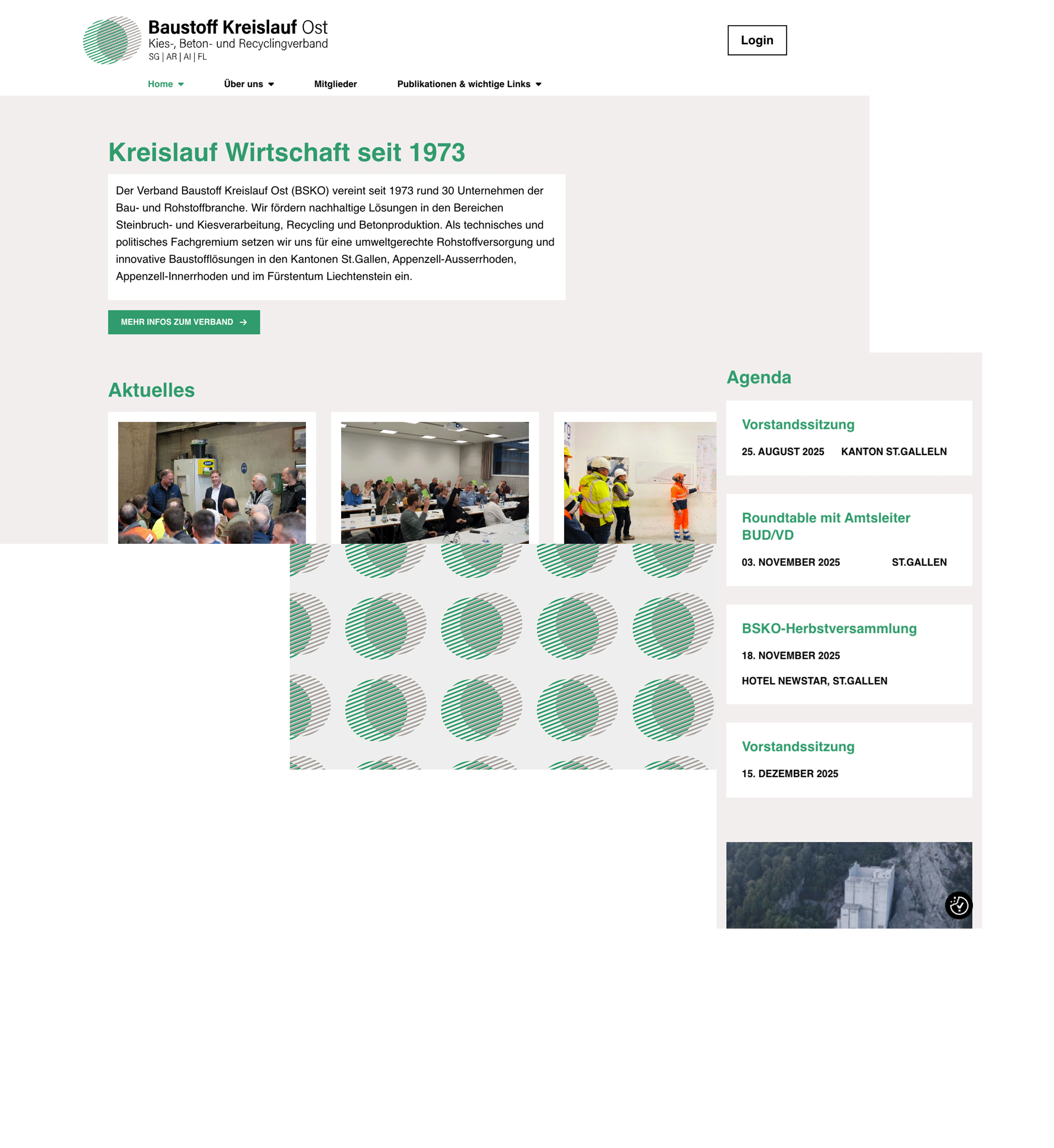 Für den Verband Baustoff Kreislauf Ost (BSKO) setzten wir den neuen Webauftritt auf Basis des bereits bestehenden Logos um. Im Mittelpunkt steht der Austausch von Informationen – sowohl mit der breiten Öffentlichkeit als auch unter den Mitgliedern. Die Webseite bietet Veranstaltungen, Dokumente und Publikationen rund um die Kies-, Beton- und Recyclingbranche. Ein geschützter Loginbereich führt zu einem eigenen Intranet, in dem Verbandsmitglieder Zugriff auf interne Informationen und Unterlagen haben. Das klare, strukturierte Design sorgt dafür, dass alle Inhalte schnell und gezielt gefunden werden können.